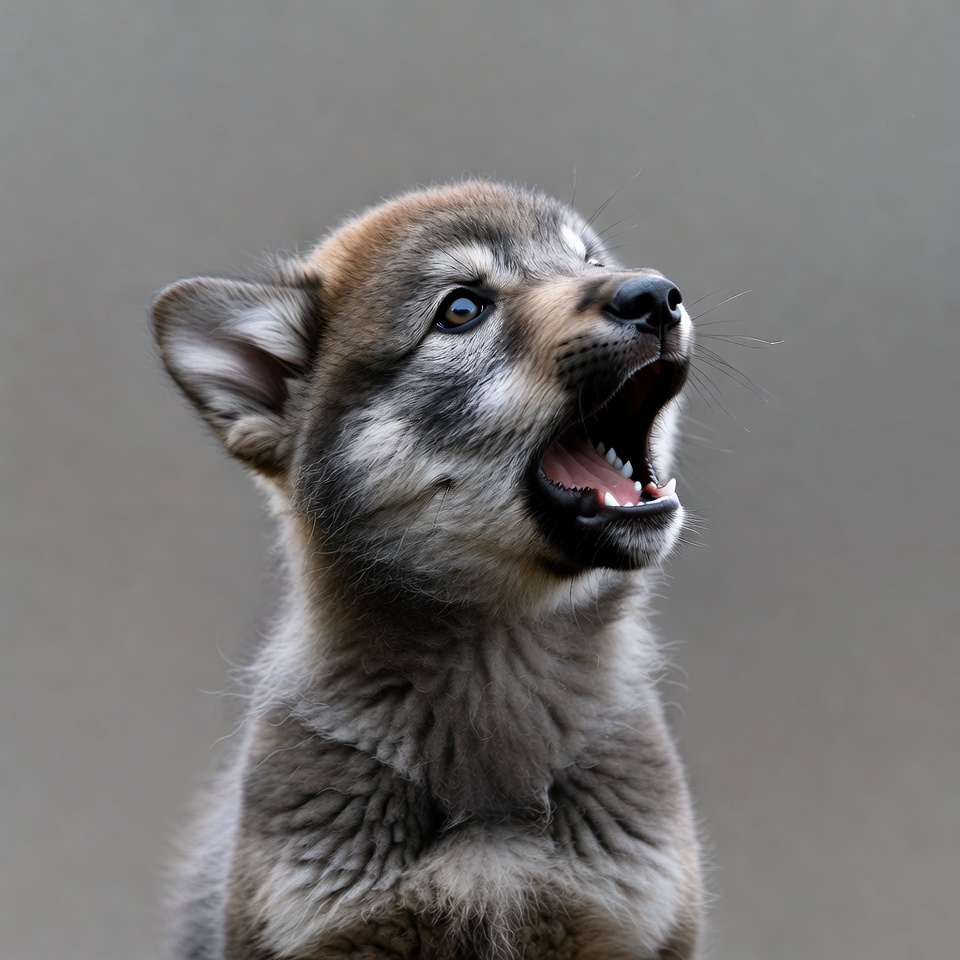 A young wolf pup with fluffy brown and gray fur stands on a plain gray background. It looks upward with bright blue eyes and its mouth wide open in a howl, revealing small teeth. Its large ears are perked up and fur is detailed around the face and neck.