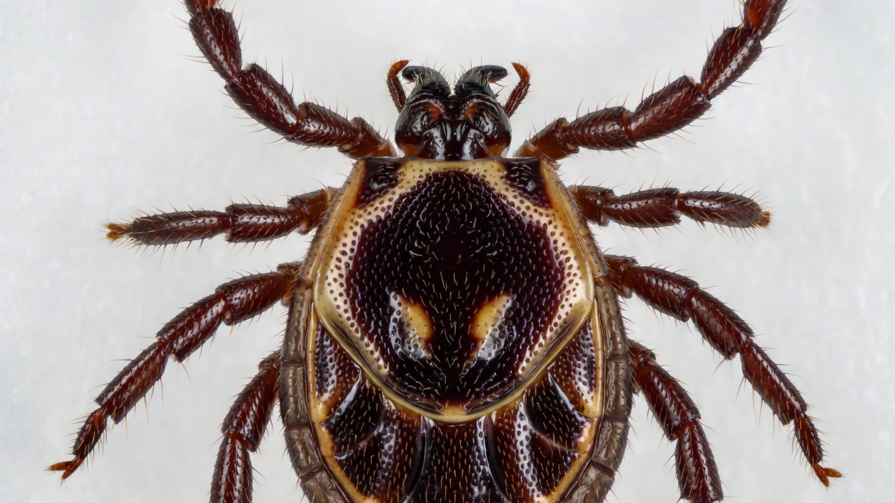 Ixodes, arachnid, arthropod, brown tick, bug, close-up, detailed, eight legs, exoskeleton, hard tick, insect, isolated, legs, macro photography, nature, parasite, red legs, scutum, white background, wildlife, yellow markings, tick