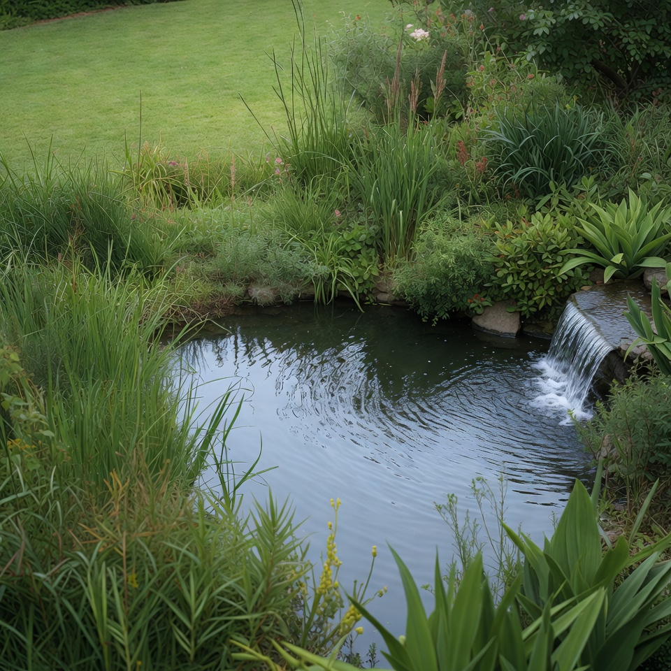 A small pond surrounded by lush green grass, tall reeds, and various plants sits in a garden. A gentle waterfall cascades into the dark green water, creating ripples on the surface. Stones line the pond's edge amid dense foliage.