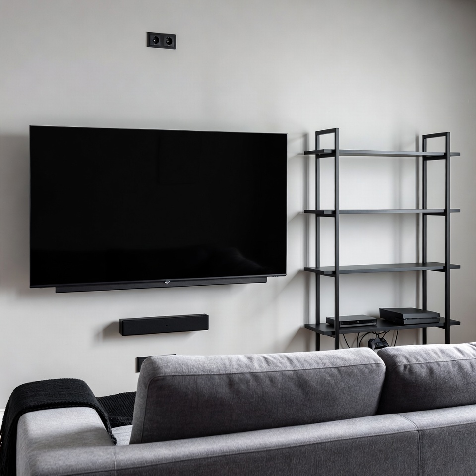 PlayStation, TV, black TV, black blanket, bookshelf, electrical outlet, electronics, fabric sofa, furniture, gaming console, gray sofa, home decor, metal shelf, minimalist, modern interior, soundbar, television, wall mounted TV, white wall, living room