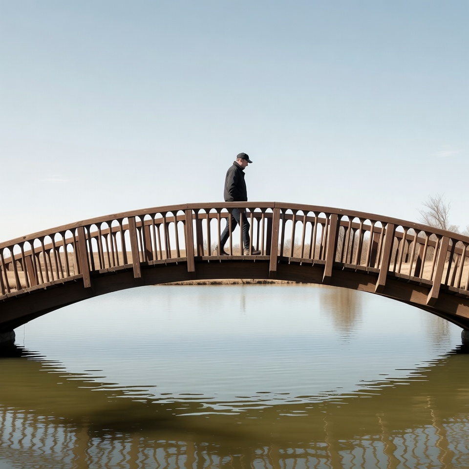 A man wearing a black jacket and cap walks across a wooden arched bridge over a calm pond. The bridge features ornate railings and reflects in the greenish water below. A clear blue sky forms the backdrop with bare trees visible in the distance.