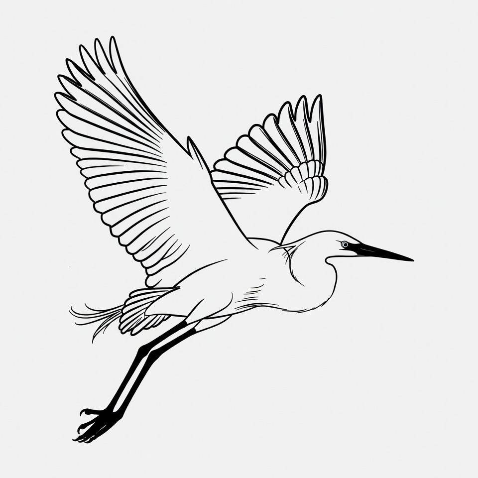 avian, bird in flight, black legs, clipart, feathers, flying bird, great egret, illustration, isolated background, line art, long beak, outline drawing, vector art, wildlife, wings spread, egret