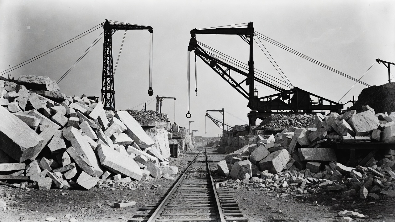 black and white, boom cranes, cables, construction cranes, debris, demolition site, ground, heavy machinery, industrial site, lifting equipment, piles, railroad tracks, railway, rubble, tracks, vintage photo, white stones, cranes