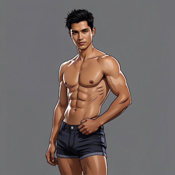 Asian, abs, athletic build, biceps, black hair, black shorts, bodybuilder, confident pose, digital art, fit male, gray background, handsome, illustration, male, man, sexy man, shirtless, shorts, six pack, toned body, young man, muscular man
