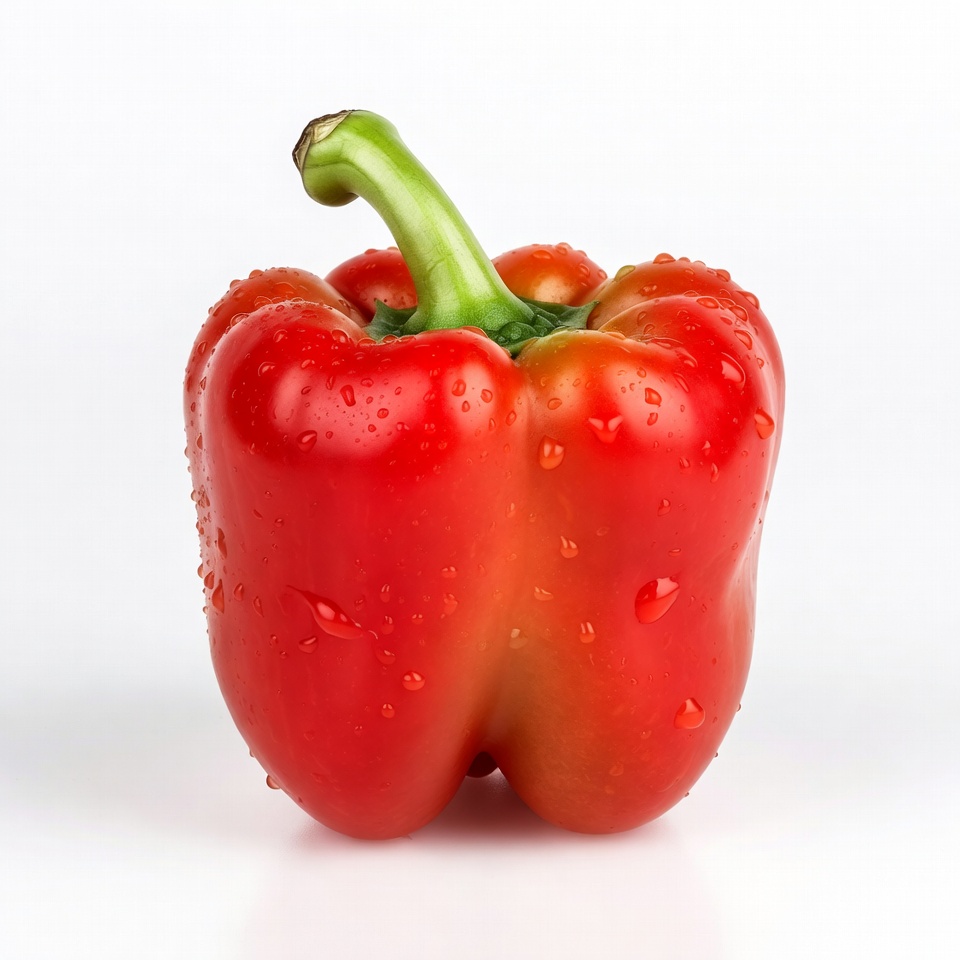 bell pepper, capsicum, dewdrops, food photography, fresh vegetable, glossy surface, green stem, isolated background, pepper plant, produce, red pepper, ripe pepper, shiny pepper, vegetable, water droplets, white background, red bell pepper