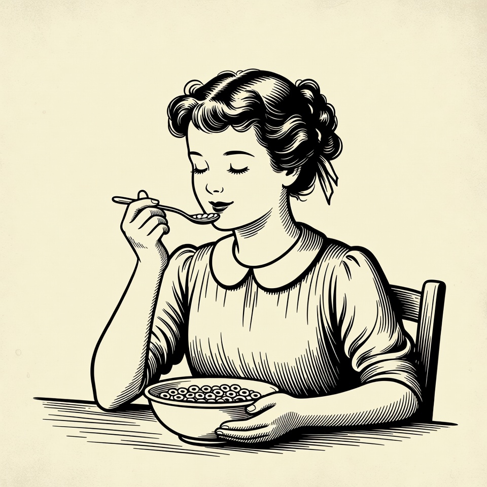 A young girl with curly hair and a hair ribbon sits at a wooden table eating cereal from a bowl with a spoon. She wears a collared vintage dress and has her eyes closed in enjoyment. The image is a detailed black and white line art illustration on a beige background.