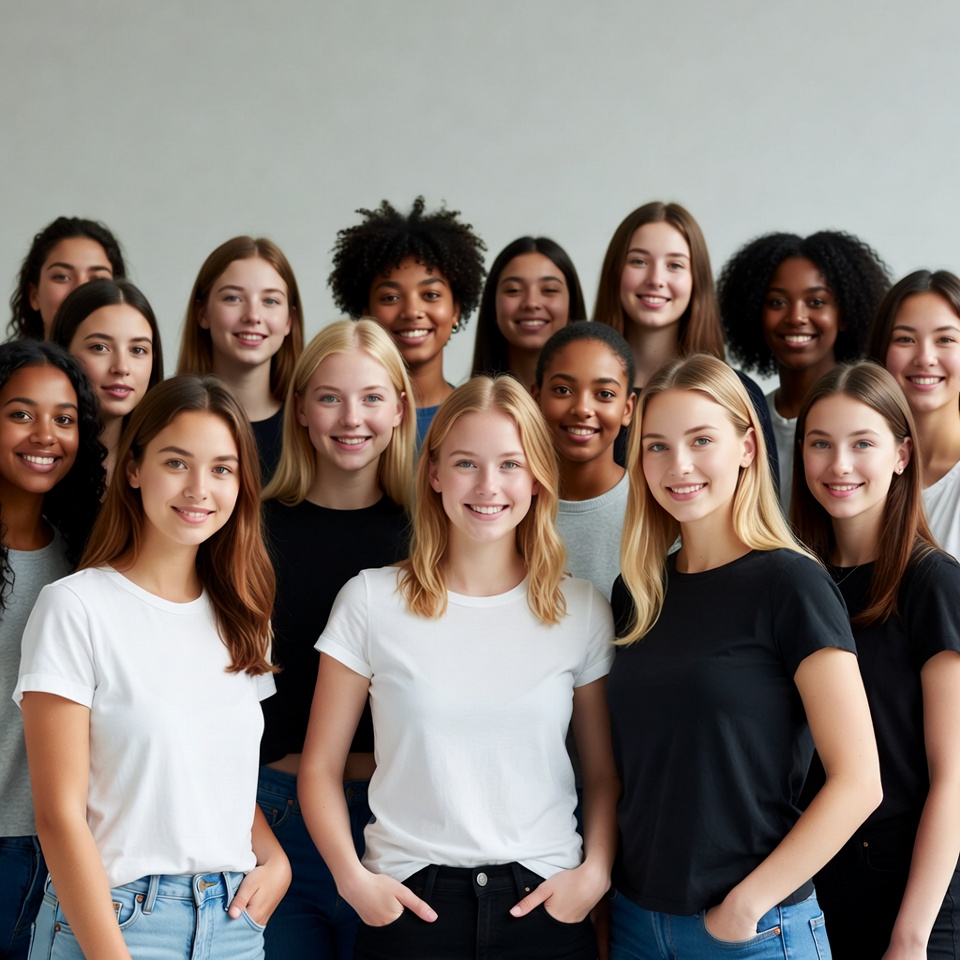 A large group of young women with diverse ethnicities stands together smiling at the camera against a plain white background. They wear casual white and black t-shirts with hands in pockets or at sides. Their hairstyles vary from straight to curly, featuring Asian, Black, White, and multiracial features.