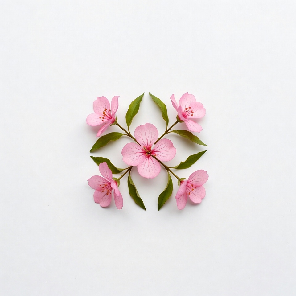 Five pink flowers with green leaves are arranged in a symmetrical cross pattern. They are centered on a plain white background. The flowers feature delicate petals and stems.