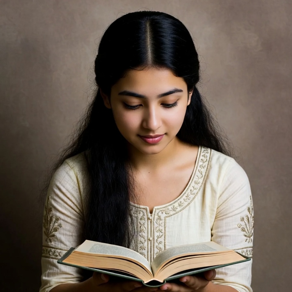 A young Indian girl with long black hair parted in the middle reads an open book intently. She wears a traditional off-white embroidered kurta with gold details. The image features a neutral beige background, isolating her focused pose.