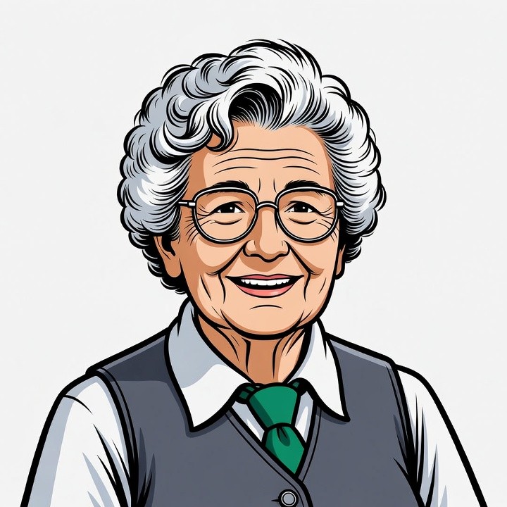 A cartoon illustration of an elderly woman with curly white hair and round glasses smiles warmly. She wears a white collared shirt, green tie, and dark vest. The image features a clean white background.