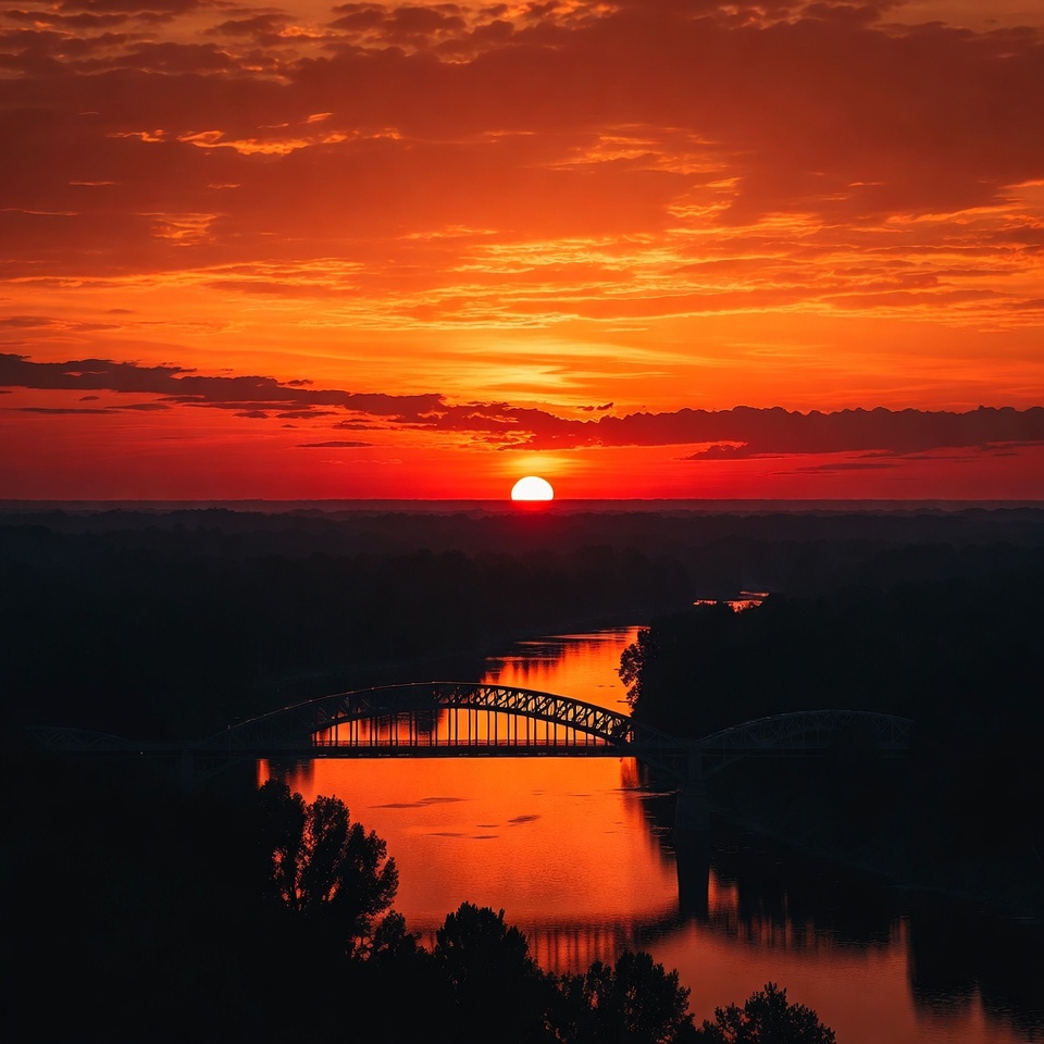 A vibrant orange sunset illuminates a silhouetted steel bridge spanning a calm river. The sun hangs low above the horizon, casting reflections on the water surrounded by dark trees. Clouds streak the fiery sky in hues of red and orange.