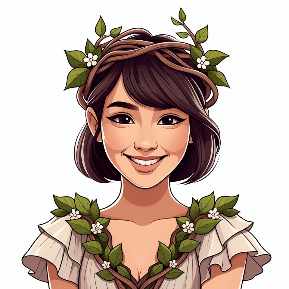 An illustrated Asian woman with short brown hair wears a wreath of brown vines and white flowers on her head. She has a smiling expression with defined eyes and wears a white off-shoulder dress adorned with green leaves and white flowers on her shoulders. The portrait is set against a plain white background.