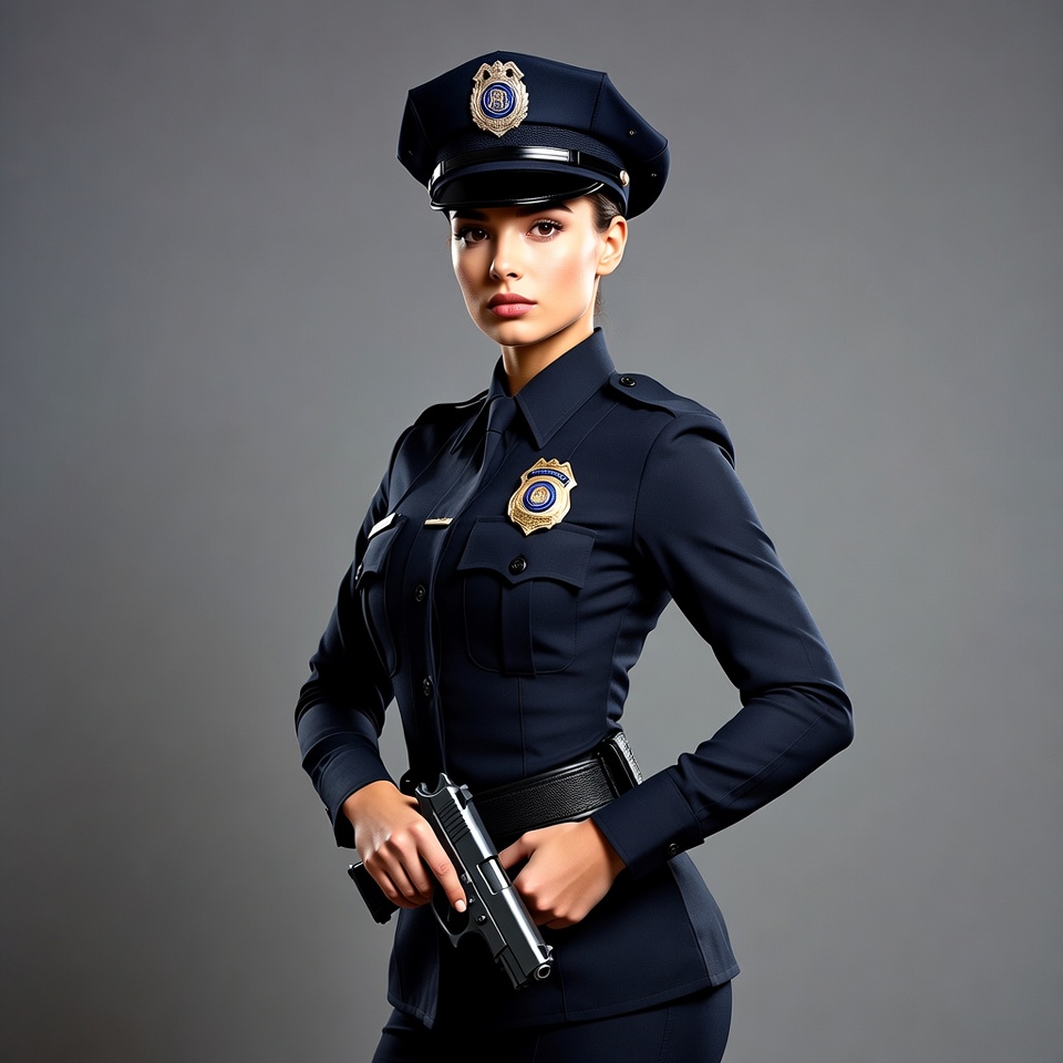 A woman in a navy blue police uniform and peaked cap stands confidently against a gray background. She grips a handgun with both hands at her waist. Gold badges adorn her hat and chest.