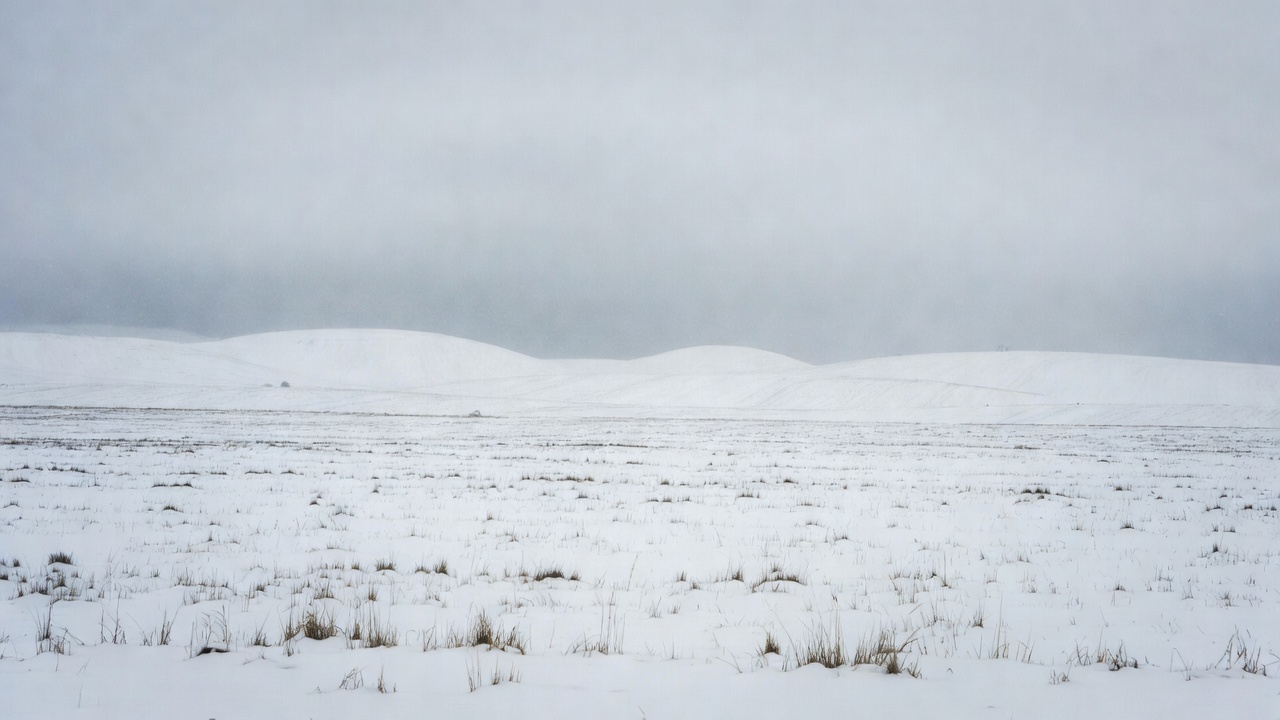 clouds, cold weather, dry grass, frozen field, gray sky, horizon, nature, outdoors, overcast sky, rolling hills, snow covered hills, vast plain, white snow, winter scene, snowy landscape