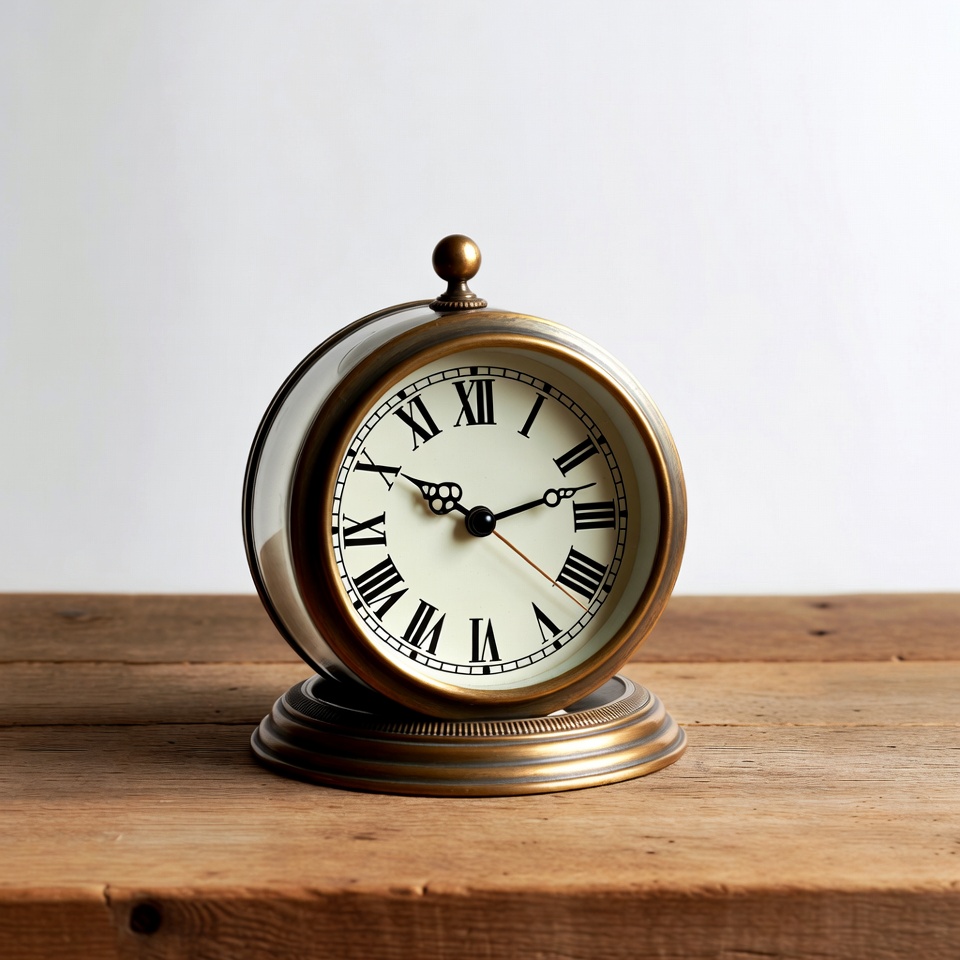 Roman numerals, antique clock, brass clock, brass frame, classic clock, clock face, clock hands, desk clock, gold clock, isolated background, round clock, tabletop clock, timepiece, vintage clock, white dial, wooden table, alarm clock