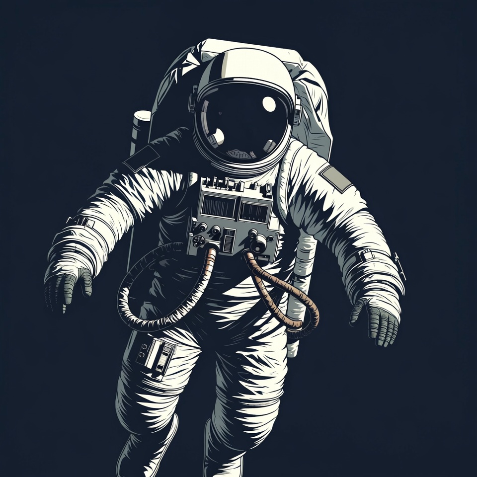 An illustration of an astronaut wearing a white spacesuit with helmet and backpack floats against a dark space background. The suit features detailed panels, tubes, and gloves. The visor reflects light, and the figure is posed dynamically with arms outstretched.