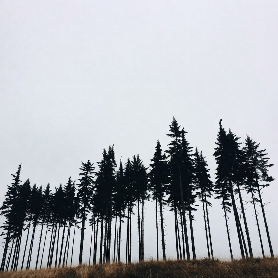 A row of tall pine trees stands in dark silhouettes against a foggy gray sky. The trees line the crest of a grassy hill with dry golden grass at the base. The scene features a minimalist landscape with no people or additional elements.
