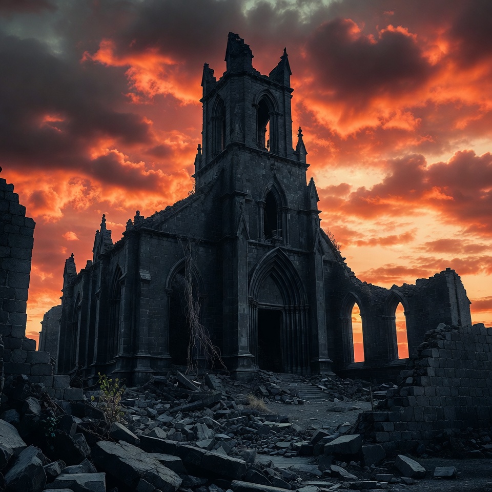 abandoned church, apocalyptic scene, arched windows, church ruins, cloudy sky, dark ruins, debris, destroyed building, dilapidated building, dramatic sky, fiery sky, gothic architecture, gothic church, gothic ruins, ivy, old church, orange sunset, red clouds, rubble, ruined cathedral, spires, stone architecture, stone church, sunset, ruined church