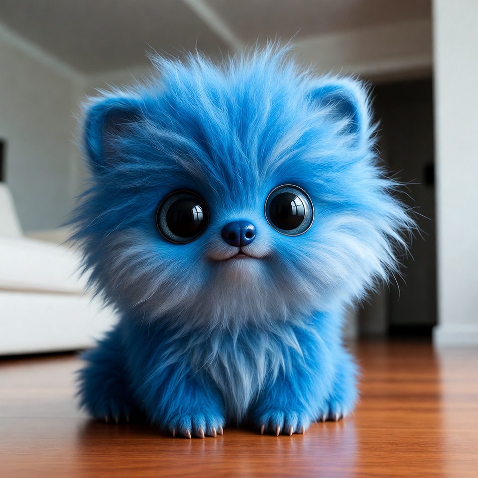 A cute fluffy blue puppy with big expressive eyes sits on a wooden floor in a modern room. Its vibrant blue fur is soft and voluminous, with tiny paws and a gentle smile. The background features a white couch and neutral walls.