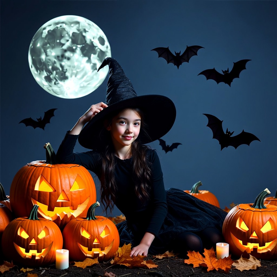 A young girl with long dark hair wears a black witch hat and dress, sitting among glowing jack-o'-lantern pumpkins on autumn leaves. She smiles playfully with one hand on her hat, surrounded by flying bats against a dark night sky with a large full moon. Candles flicker near the carved pumpkins on the ground.