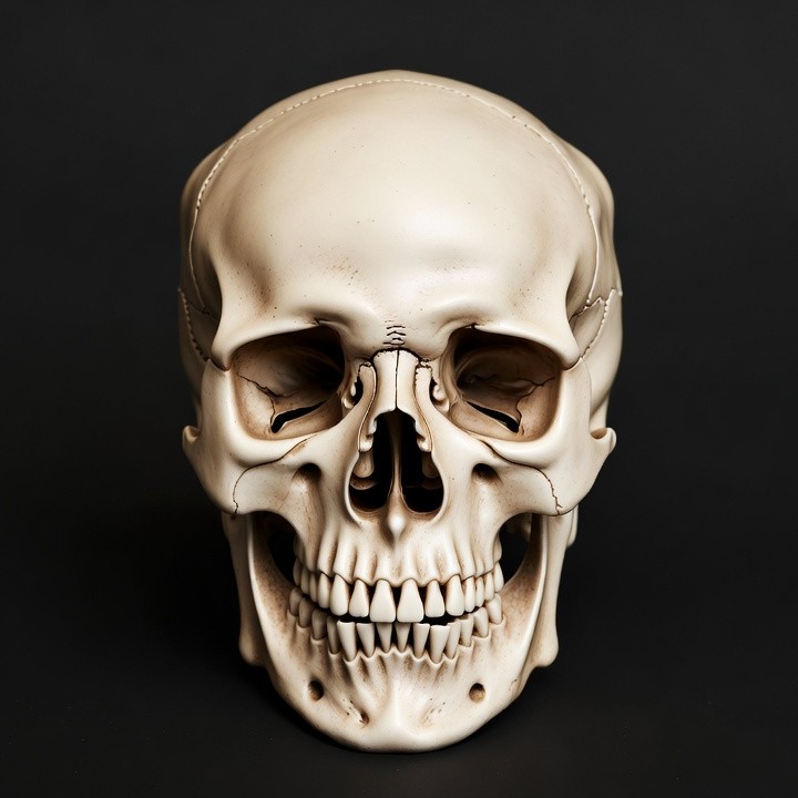 A realistic human skull with a smooth off-white surface is centered against a solid black background. The skull features detailed eye sockets, nasal cavity, and prominent teeth in an open grin. It is viewed straight on with subtle shadows enhancing its three-dimensional form.
