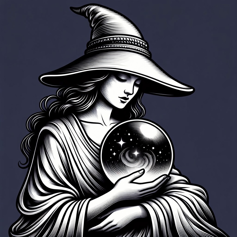A detailed black and white illustration depicts a woman dressed as a witch with a wide-brimmed pointed hat and flowing robe. She gazes serenely at a glowing crystal ball cradled in her hands, filled with stars and a swirling galaxy. The artwork features intricate line work on a dark background.