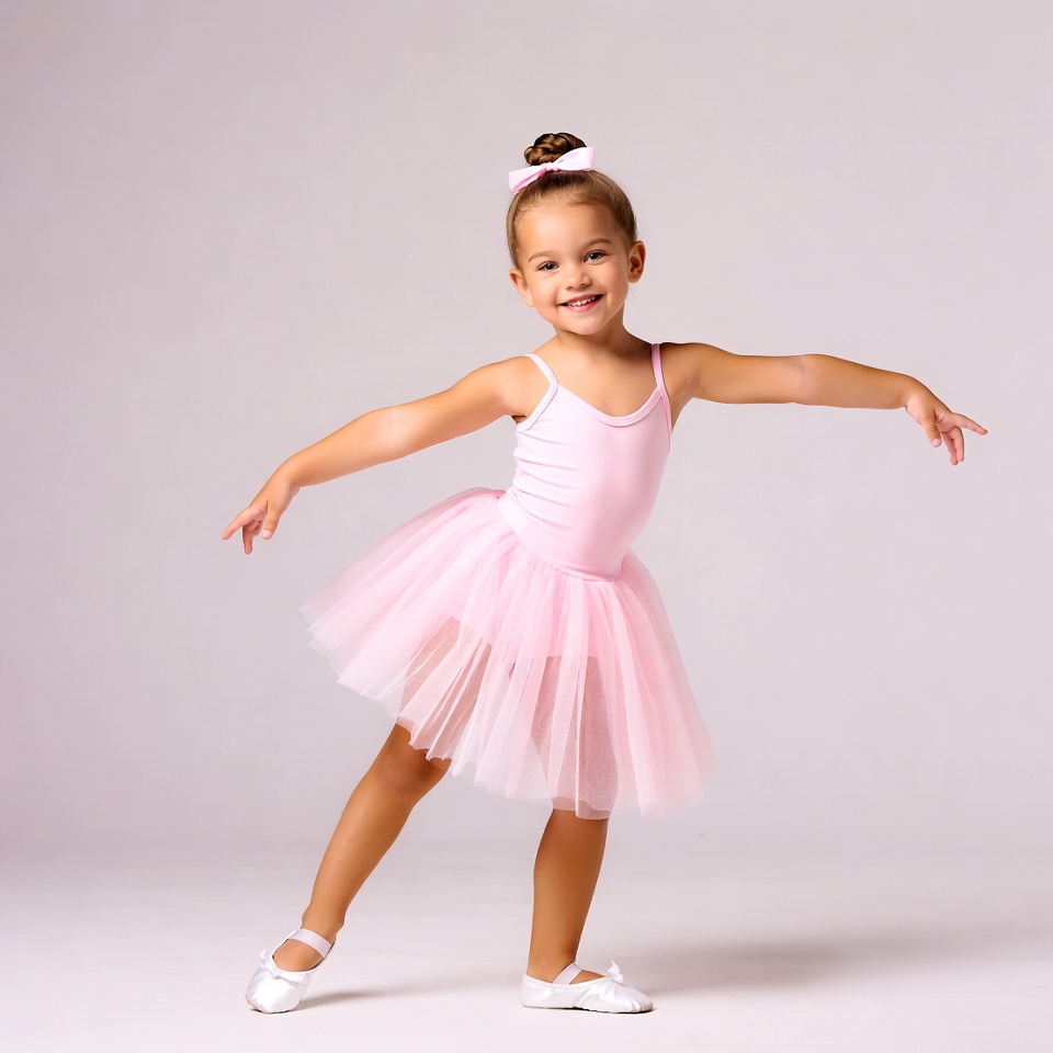 A young girl with tan skin and brown hair in a bun smiles while posing in a ballet stance. She wears a pink camisole leotard with a matching tulle tutu skirt and white ballet slippers with straps. She stands on one leg with arms extended gracefully against a plain gray background.