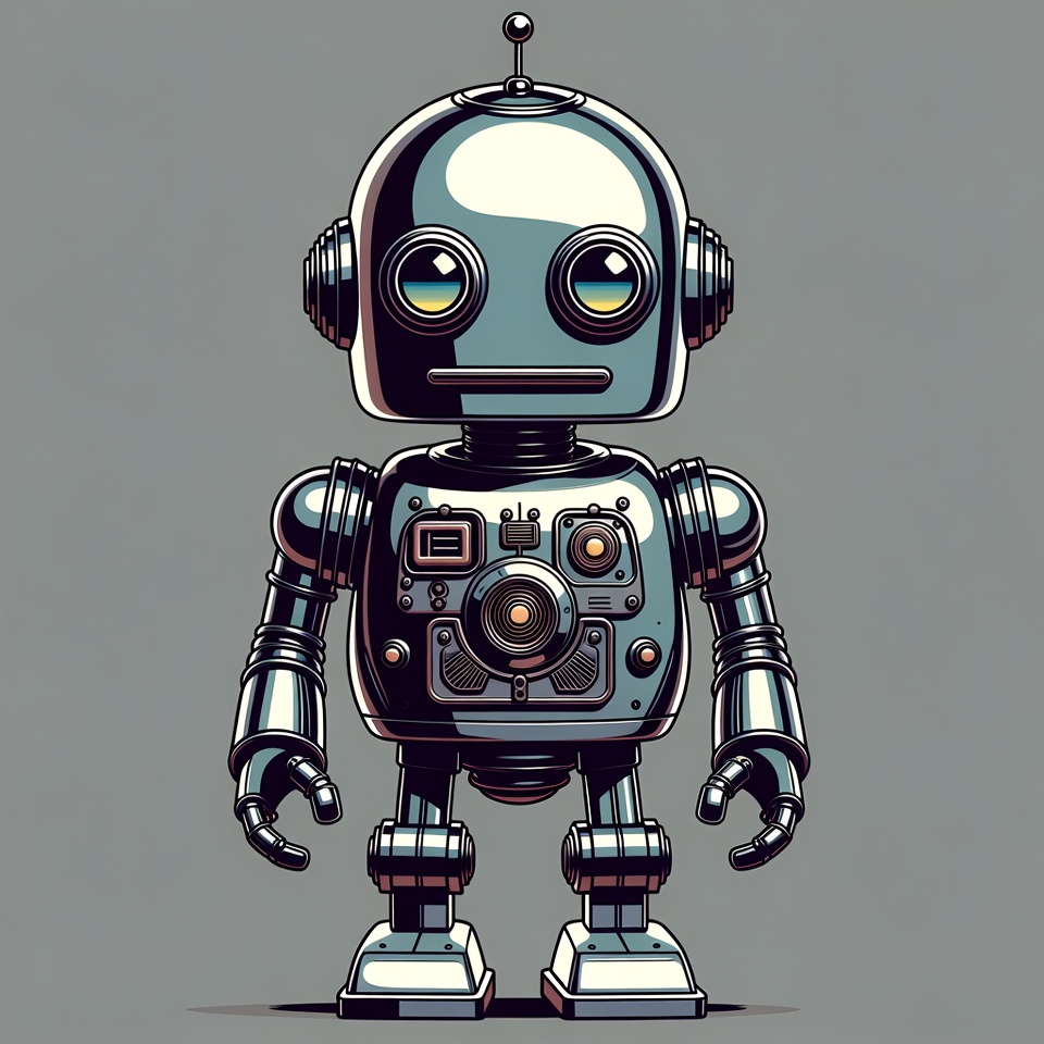 antenna, blue eyes, cartoon robot, cute robot, futuristic, illustration, isolated background, mechanical, retro robot, sci-fi, shiny metal, silver robot, standing robot, vintage style, robot