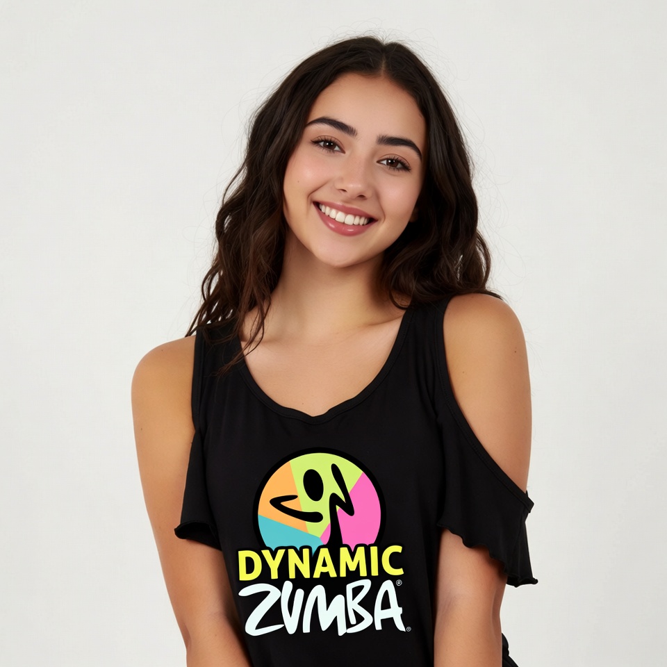 A young woman with long wavy dark hair smiles at the camera while wearing a black off-shoulder t-shirt featuring the Dynamic Zumba logo. The colorful Zumba logo includes a stylized dancer figure in green, yellow, and pink on a circular background. She stands against a plain white background.
