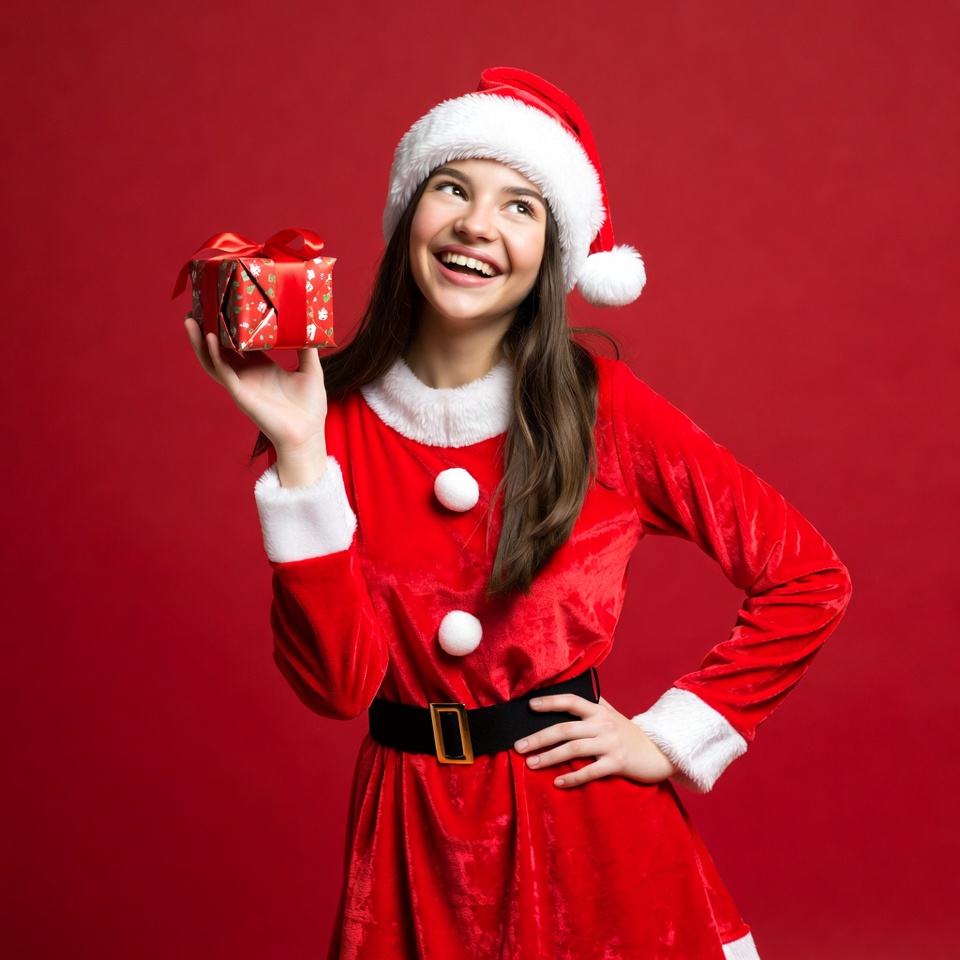 A young girl with long brown hair wears a red Santa dress, white-trimmed hat, and black belt. She smiles happily while holding up a small red gift box with a bow. She poses confidently against a solid red background.