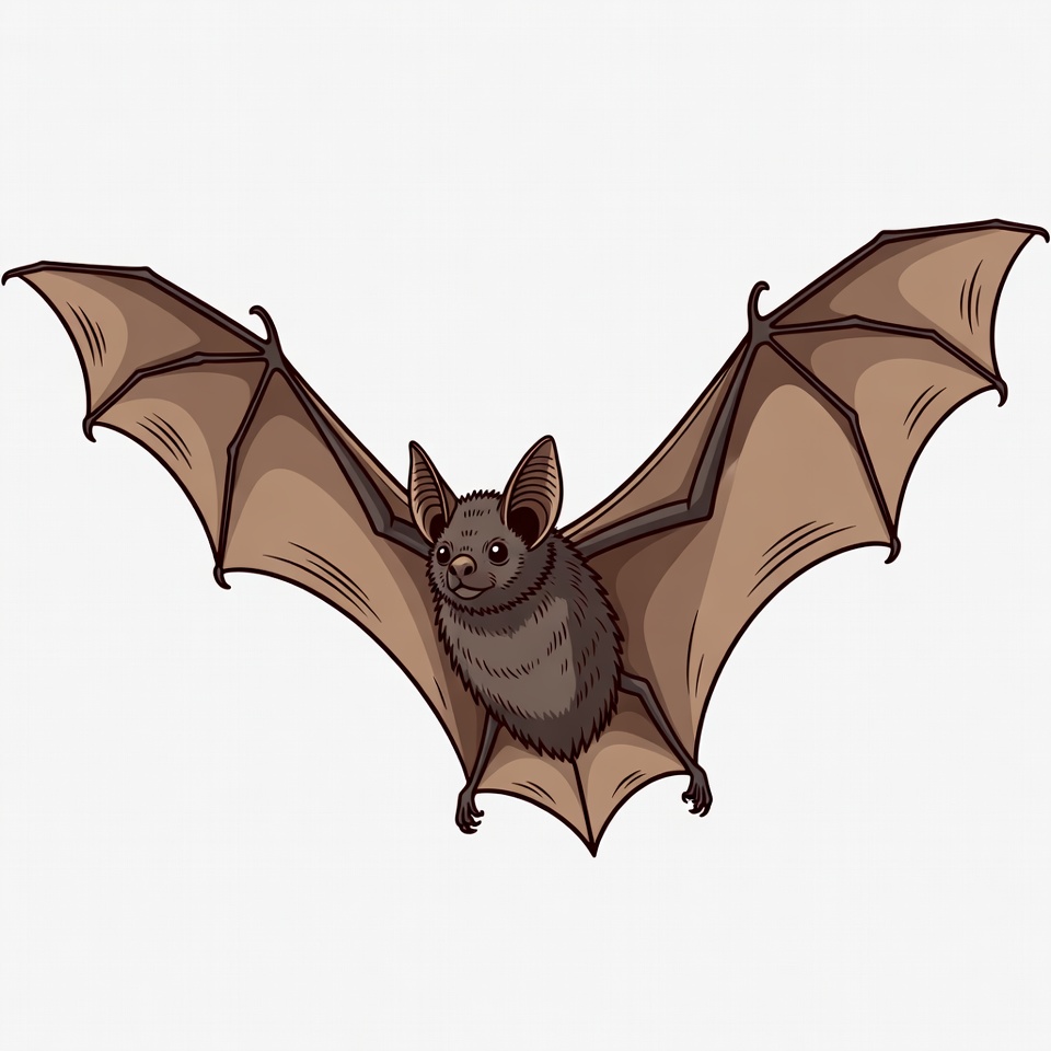 A detailed cartoon illustration of a brown bat with large spread wings and fuzzy body. The bat faces forward with visible ears, nose, and claws on its wings. It is depicted on a transparent background.