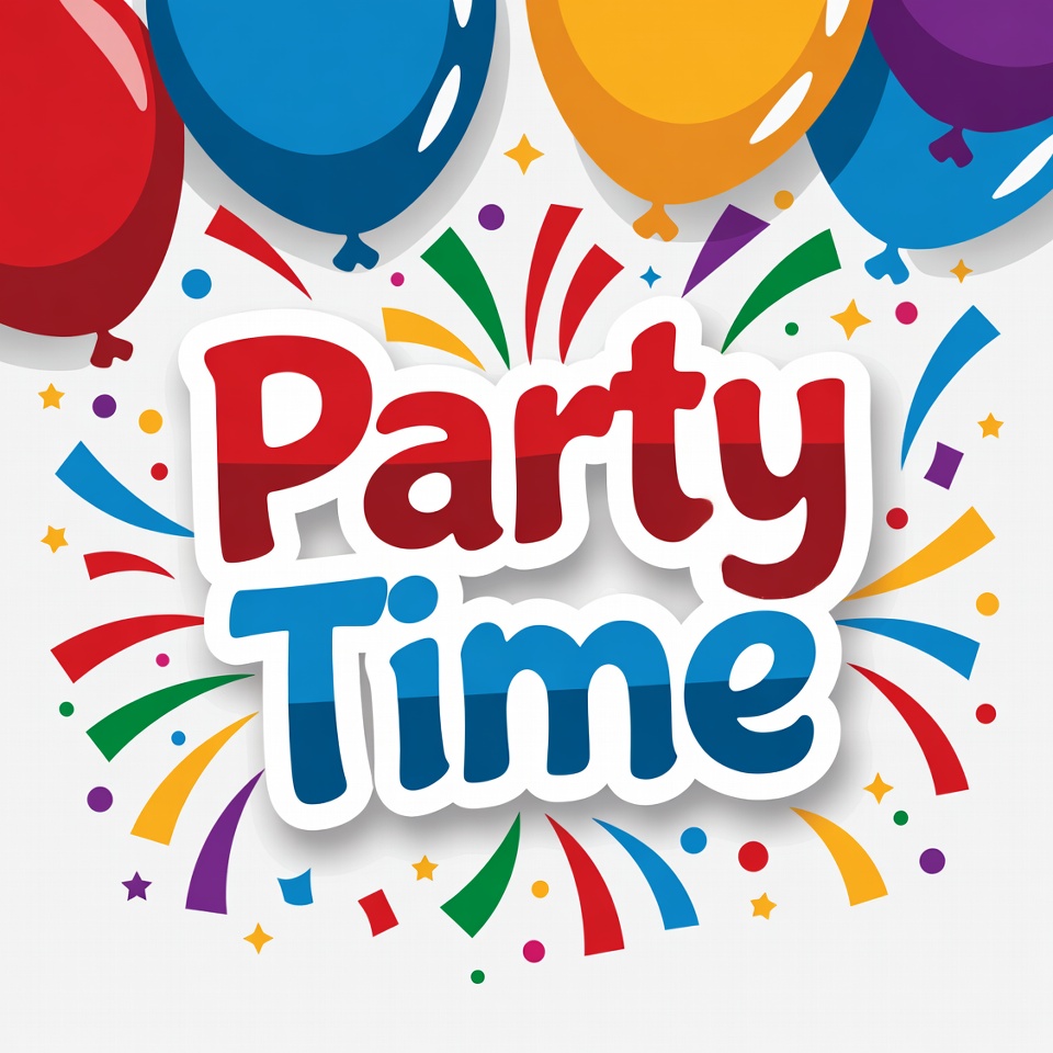 A vibrant illustration features colorful balloons in red, blue, yellow, and purple floating above the bold text 'Party Time' in red and blue letters. Bright confetti and stars surround the elements on a white background. The design is festive and cartoon-style.