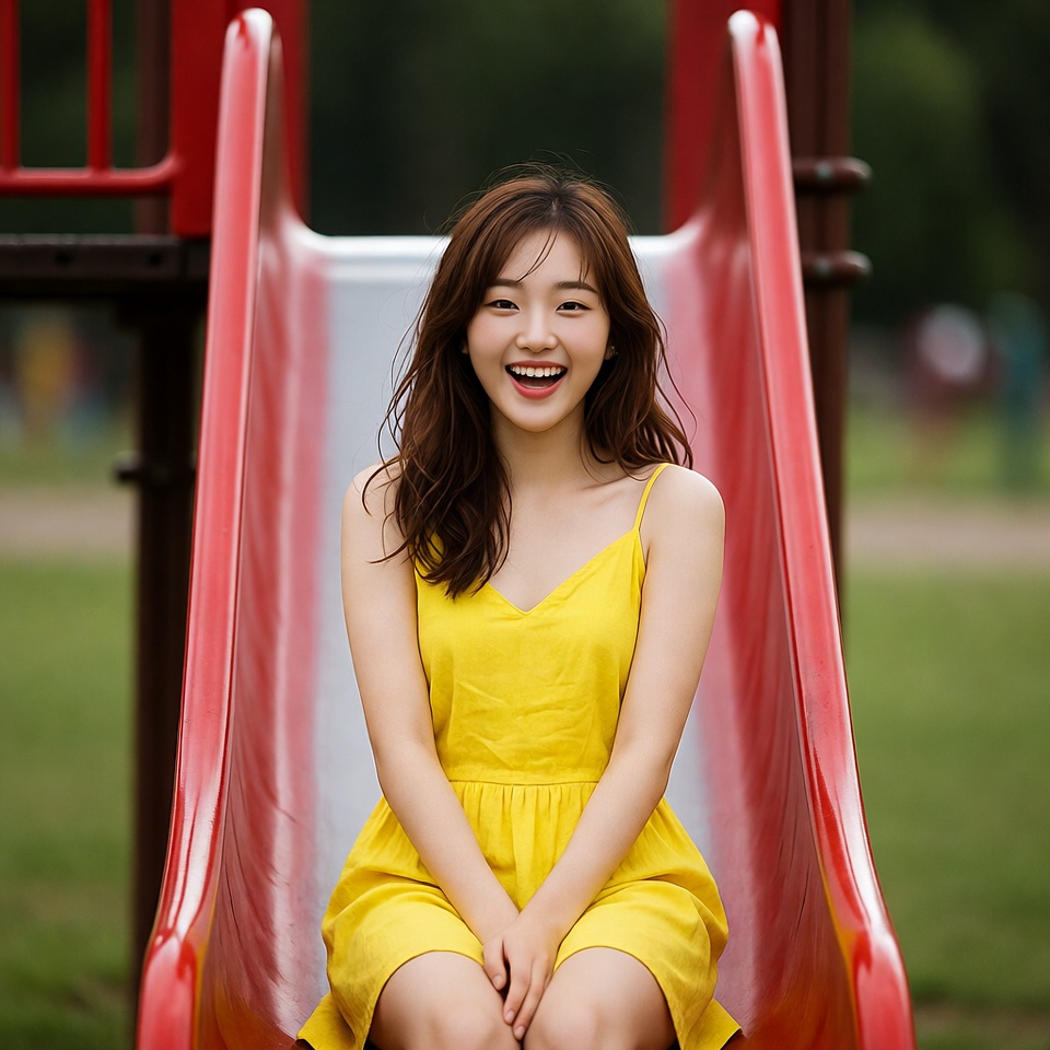 A young Asian woman with long brown hair smiles happily while sitting on a red playground slide. She wears a sleeveless yellow dress and sits with her knees together. The slide has silver steps, and green grass and trees are visible in the background.