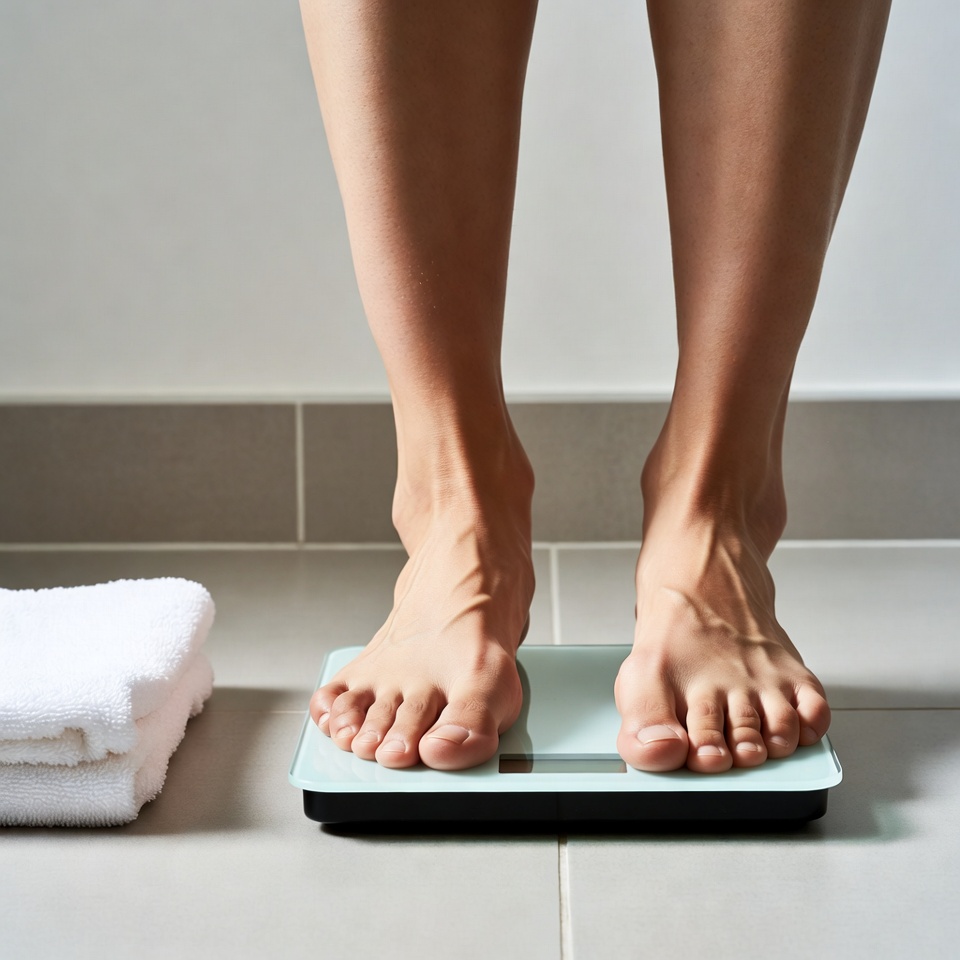 A woman with bare legs stands on a digital bathroom scale in a tiled bathroom. A white towel is folded on the floor beside the scale. Her feet are positioned squarely on the scale's surface against a plain wall.