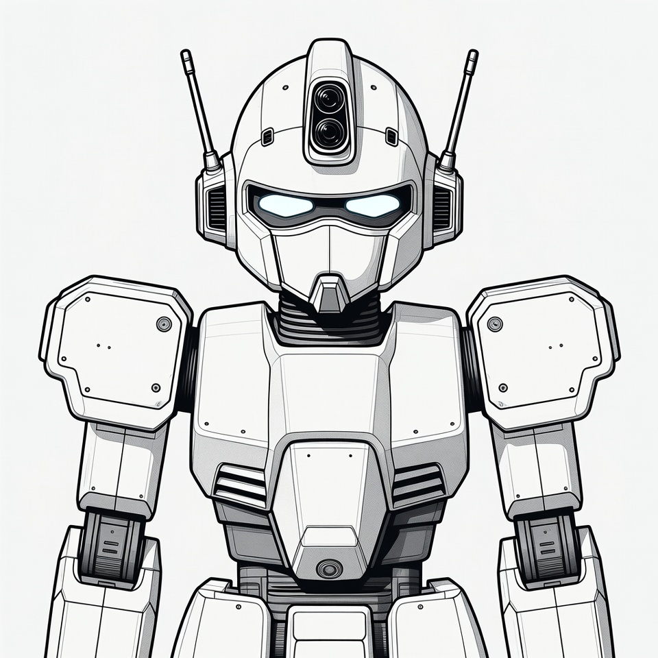 A detailed line art illustration of a white humanoid robot with a helmet-like head featuring antennae, glowing blue visor eyes, and sensors. The robot has broad shoulders, segmented armor plating on the chest and arms, and mechanical joints on the legs. It stands posed against a plain white background.