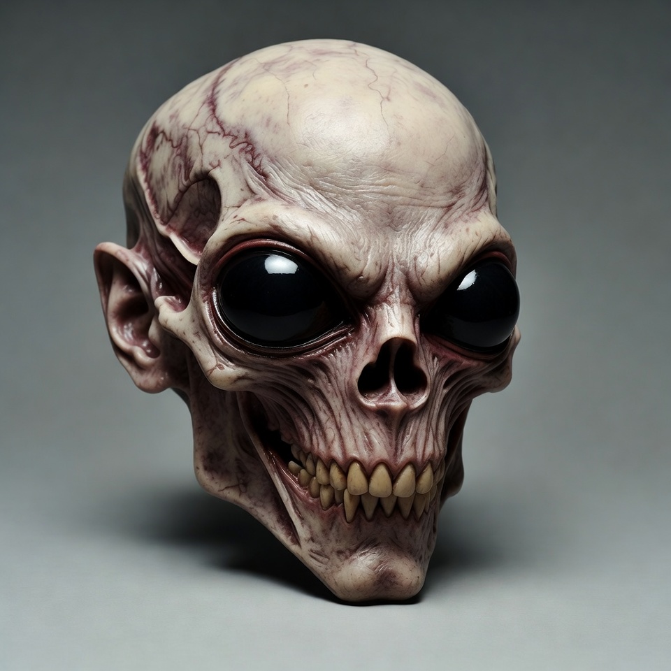 3D model, alien head, black eyes, creature head, detailed skull, elongated ears, extraterrestrial, fangs, grinning skull, horror skull, isolated background, large eyes, monstrous skull, pale skull, sci-fi skull, sculpture, skull, alien skull