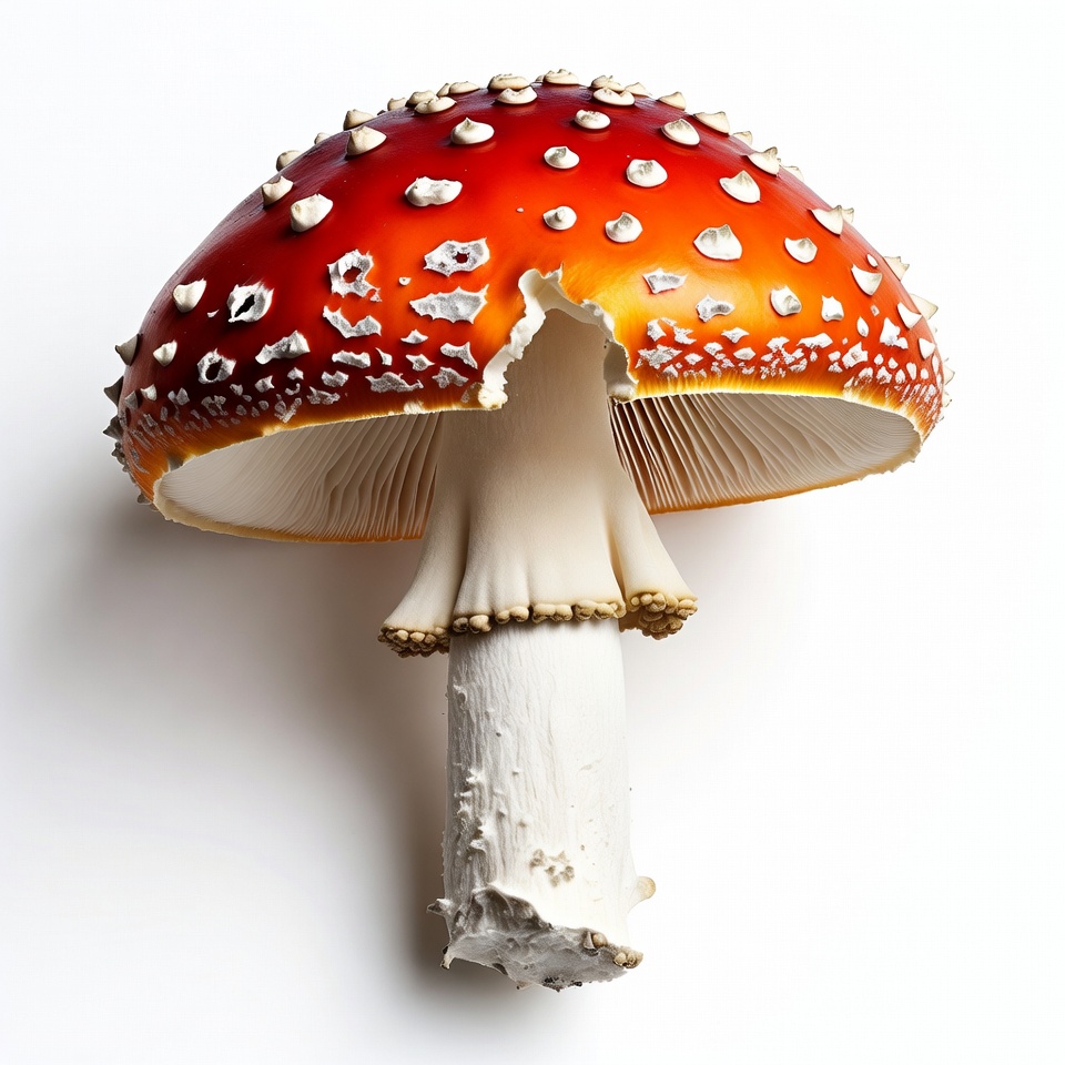 amanita muscaria, forest mushroom, fungus, isolated, macro photography, mushroom cap, mushroom stem, nature, poisonous mushroom, red mushroom, top view, white background, white gills, white spots, fly agaric