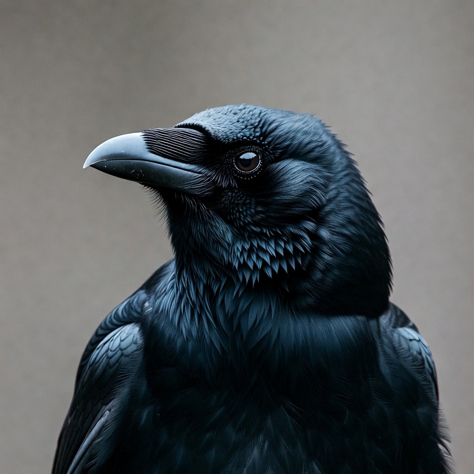 A large black raven faces the camera with a sharp beak and piercing yellow eye. Its glossy feathers show detailed texture against a neutral gray background. The bird is captured in a profile view, highlighting its head and neck.