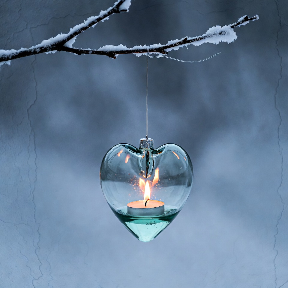 Christmas ornament, candle, flame, glass lantern, glowing heart, hanging lantern, heart shaped, isolated background, lit candle, love symbol, romantic light, snow, snowy branch, teal glass, winter, winter decoration, heart lantern