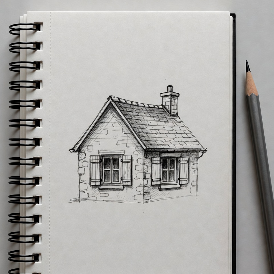A detailed pencil sketch of a small stone house with a sloped roof and chimney is drawn on a white page of an open spiral-bound notebook. The house features shuttered windows and textured stone walls. A pencil lies diagonally across the bottom of the page.