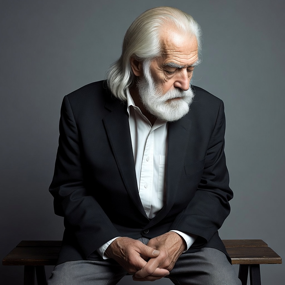 White, formal attire, gray background, gray pants, hands clasped, long hair, male, old man, portrait, senior citizen, serious expression, sitting, suit jacket, white beard, white hair, white shirt, wooden bench, elderly man