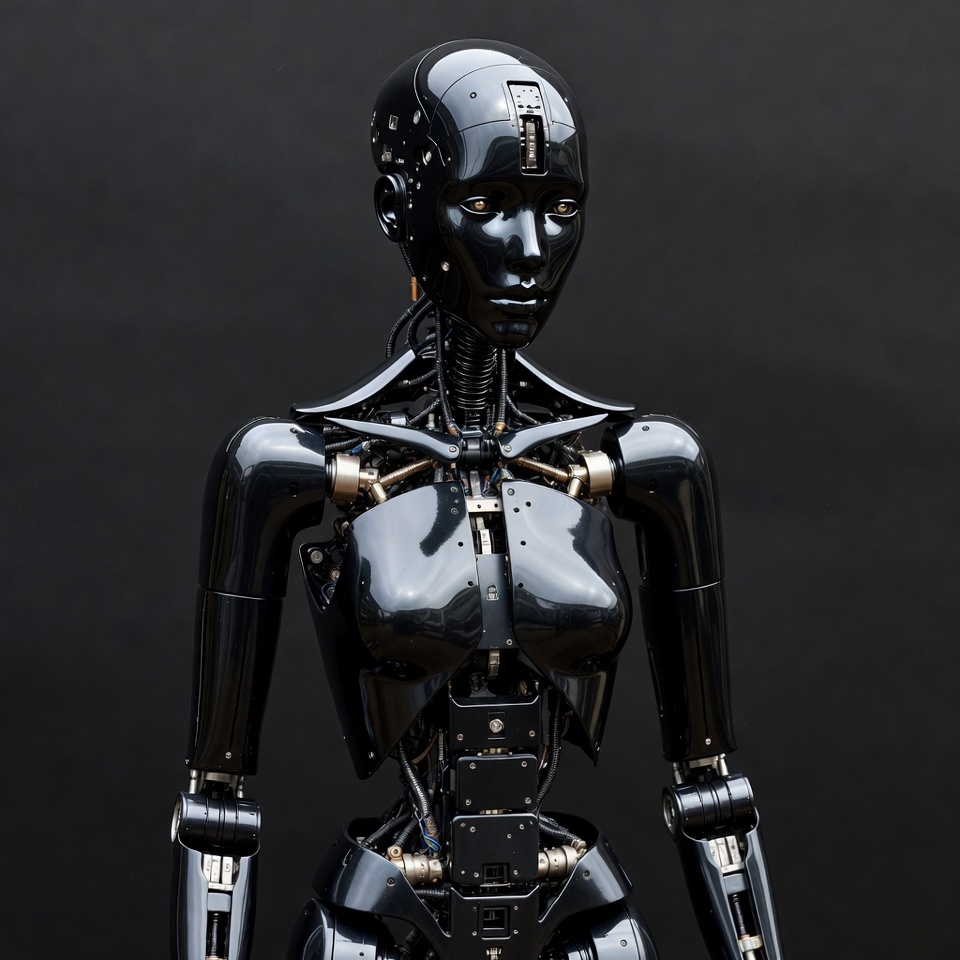 android, artificial intelligence, black robot, cyborg, female robot, futuristic robot, glossy robot, humanoid robot, isolated background, mechanical body, panels, robot eyes, robot face, robot joints, sci-fi robot, standing robot, technology, wires, robot