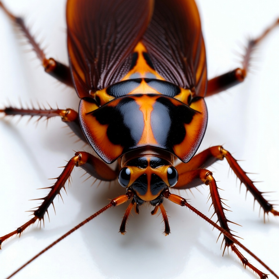 antennae, arthropod, black head, brown cockroach, bug, closeup, compound eyes, insect, isolated, legs, macro photography, orange markings, spines, white background, wings, cockroach