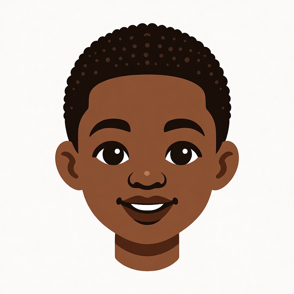 A cartoon illustration of a young African-American boy with short curly black hair and big expressive eyes. He has a wide smile showing white teeth and smooth brown skin. The image features his face and head on a transparent background.