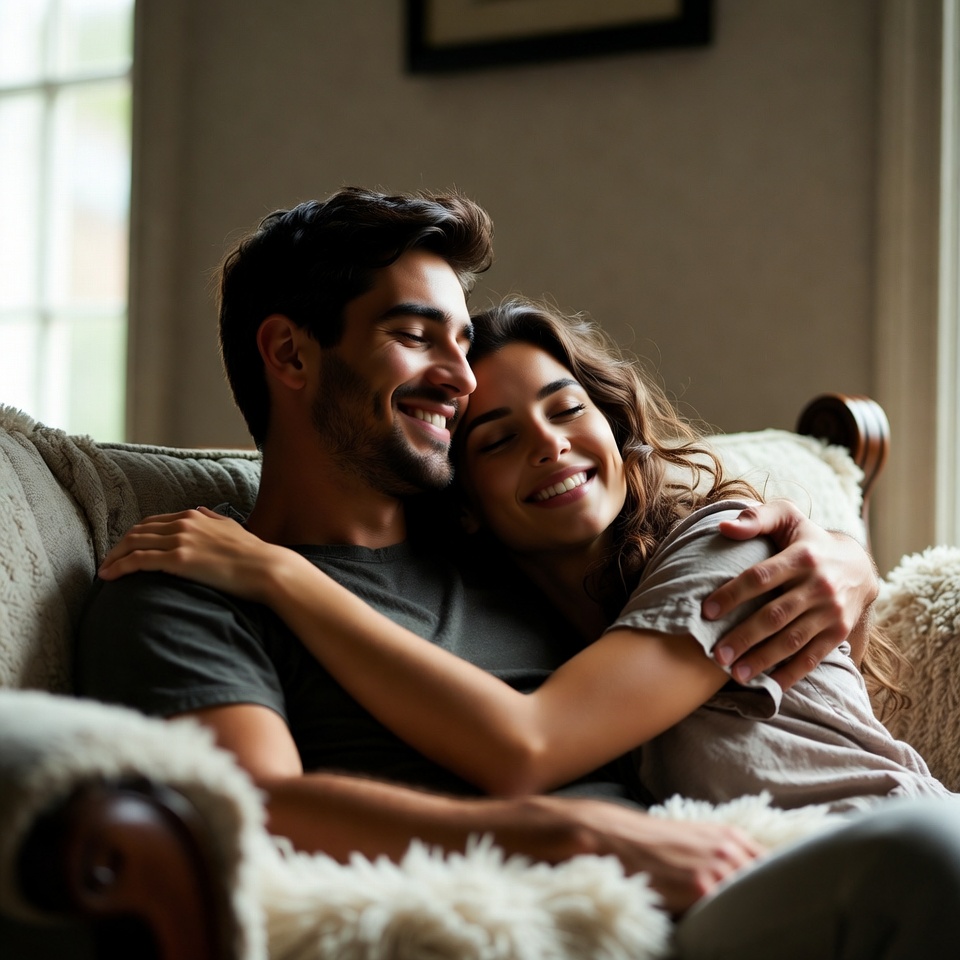 A smiling man with dark hair hugs a smiling woman with wavy brown hair from behind on a plush beige couch. They sit close together in a sunlit living room with large windows and framed artwork on the walls. Both wear casual gray shirts and appear joyful.