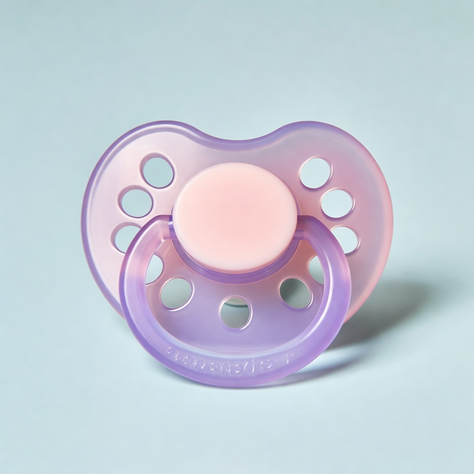 baby accessories, baby pacifier, baby product, clipart style, infant soother, isolated background, light blue background, nipple shield, pacifier, pastel colors, pink nipple, purple pacifier, translucent pacifier, ventilation holes