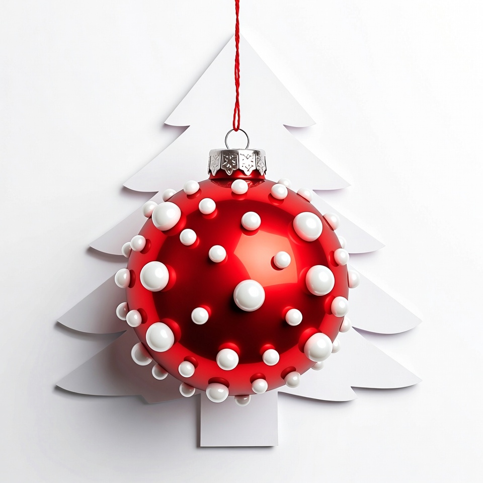Christmas decor, Christmas tree, festive ball, glossy ornament, hanging ornament, holiday decoration, isolated background, ornament closeup, paper cutout, red ornament, red string, shiny bauble, silver top, tree silhouette, white background, white dots, white pearls, white tree, winter holiday, Christmas ornament