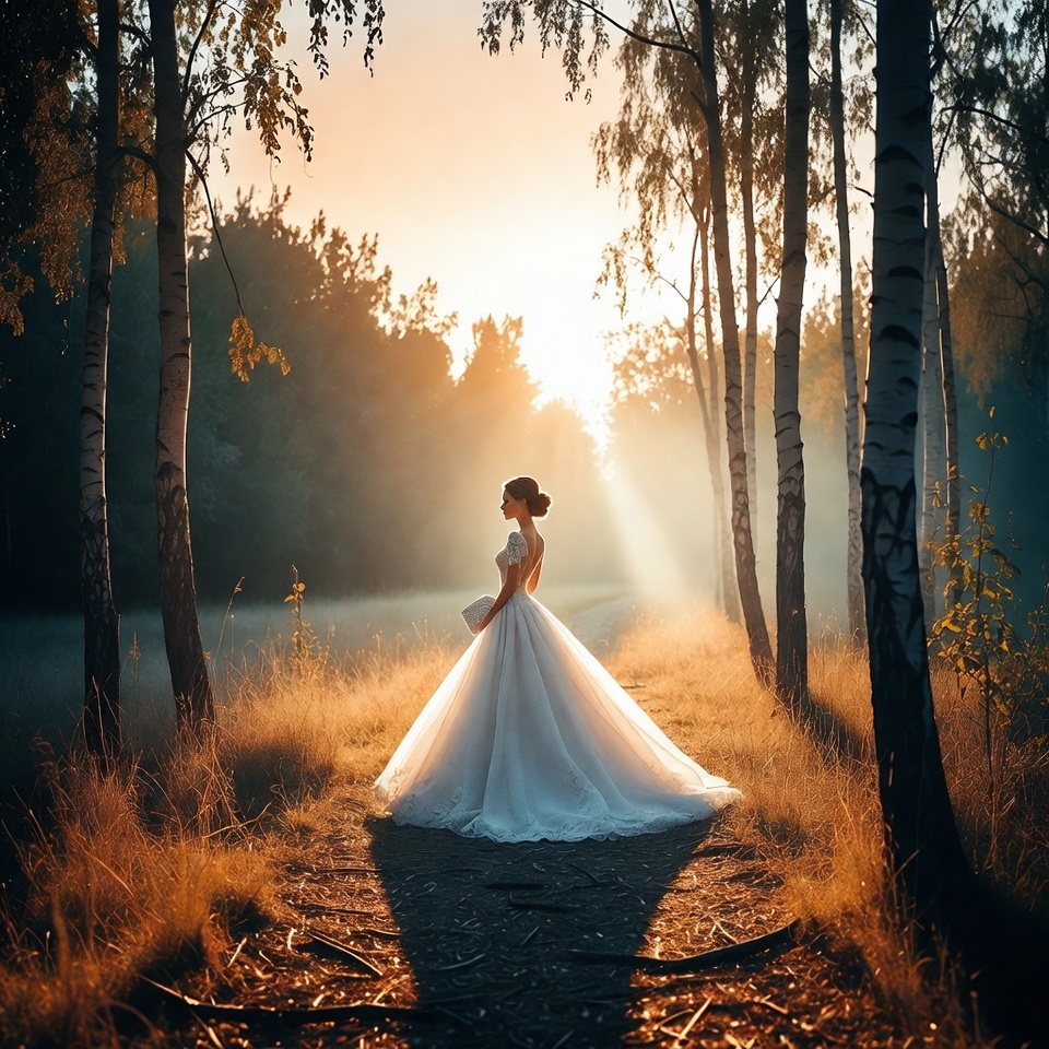 A woman in a flowing white wedding dress stands with her back turned in a birch forest at sunset. Sunlight rays filter through the tall white-barked trees, casting a golden glow on the tall grass and path. She holds a bouquet and has her hair styled in an elegant updo.