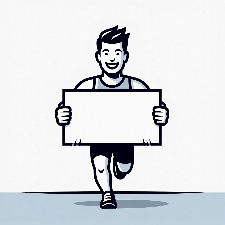 A cartoon man with short hair smiles while holding a large blank rectangular sign in front. He wears a sleeveless tank top, shorts, and sneakers, and stands in a dynamic running pose on one leg. The illustration features bold black line art on a white background.