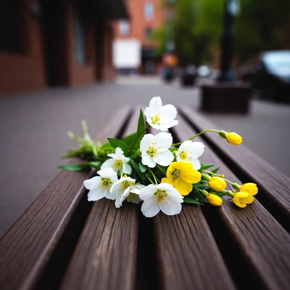 A bouquet of delicate white flowers and yellow buttercups rests on a weathered wooden bench. The bench is situated on a blurred urban street with red brick buildings, green trees, and a streetlamp in the background. The flowers are fresh with green stems and leaves, sharply focused against the soft bokeh backdrop.